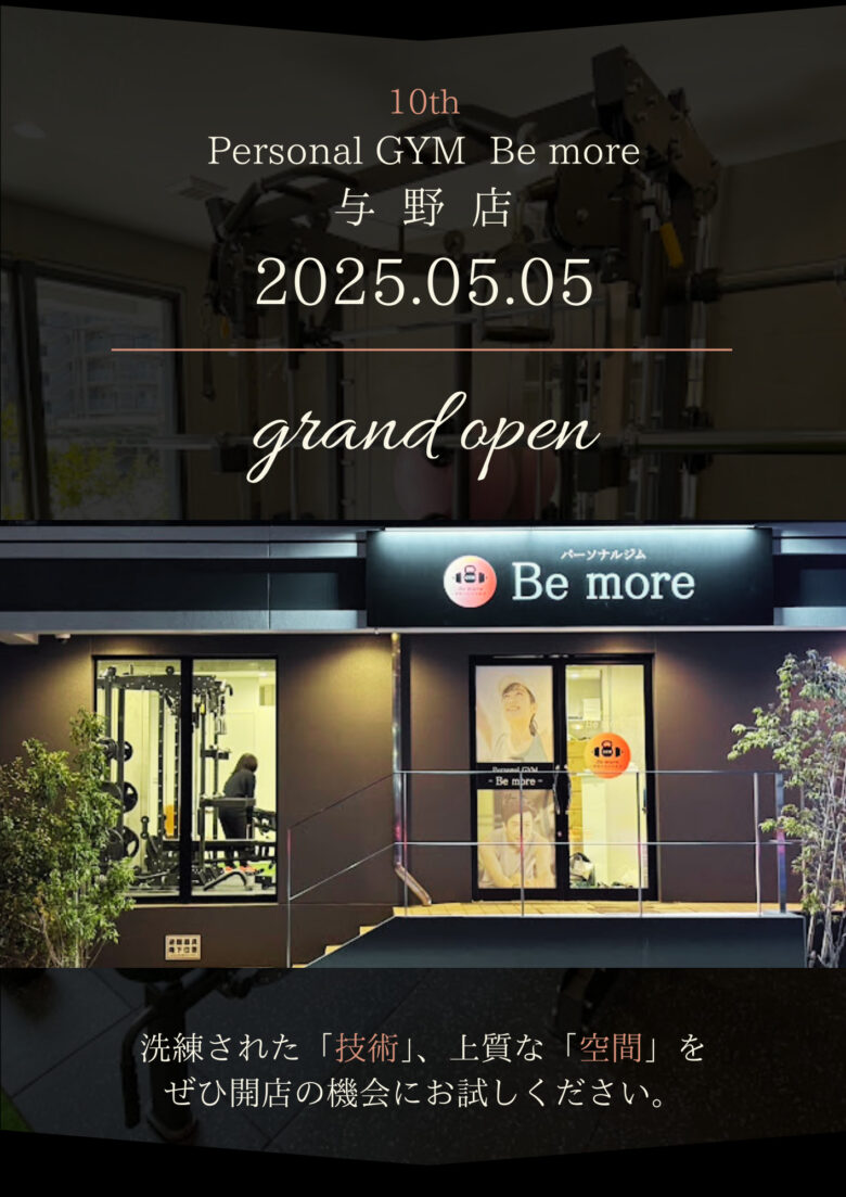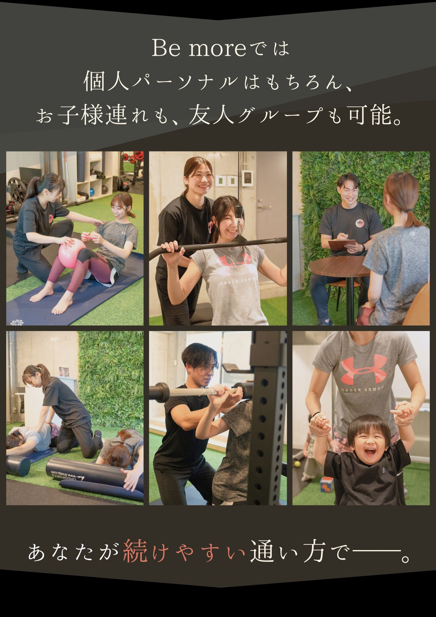 Be more大宮に通いはじめて、約2年になります。今回、自転車で行けるので、与野店でトレーニング受けました。還暦前に身体の不調を感じ、パーソナルにチャレンジ。肩の痛みはなくなり、家でできるトレーニングも教えてもらいセルフケアにもつながってます。変形性股関節、頚椎症など、いろいろ抱える身体ですが、いつも的確にアドバイス頂き、日々現状維持から改善につながるトレーニングと最後のマッサージが至福の時です。体調に応じてメニュー考えてくださる諏江先生には感謝です。娘と一緒に通っていた時期もあり、楽しく続けられます。夫婦やお子様連れの方もいて、おすすめです。
