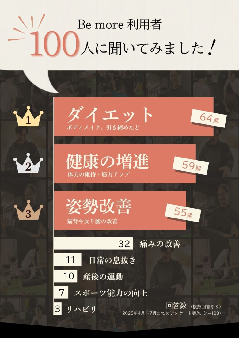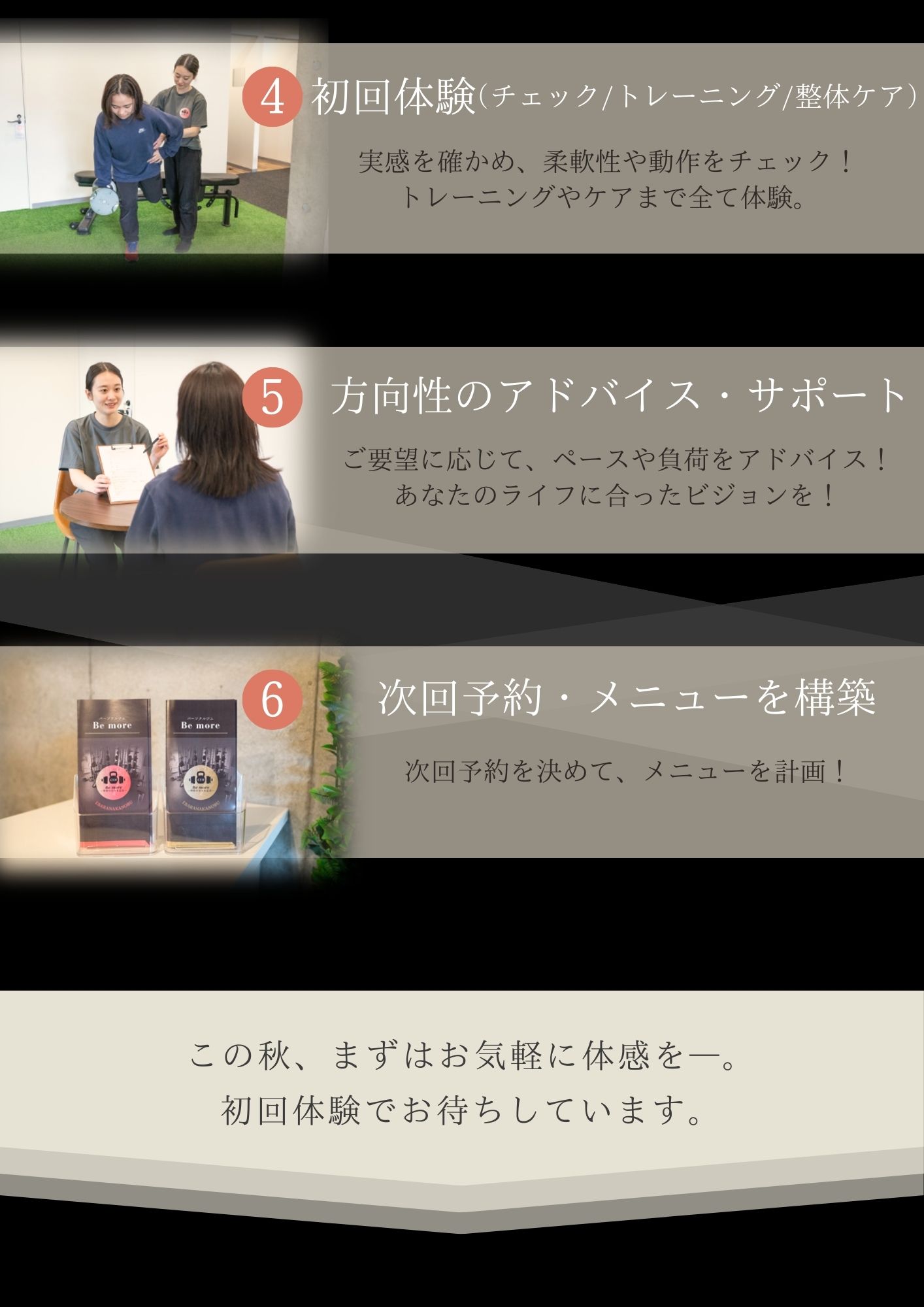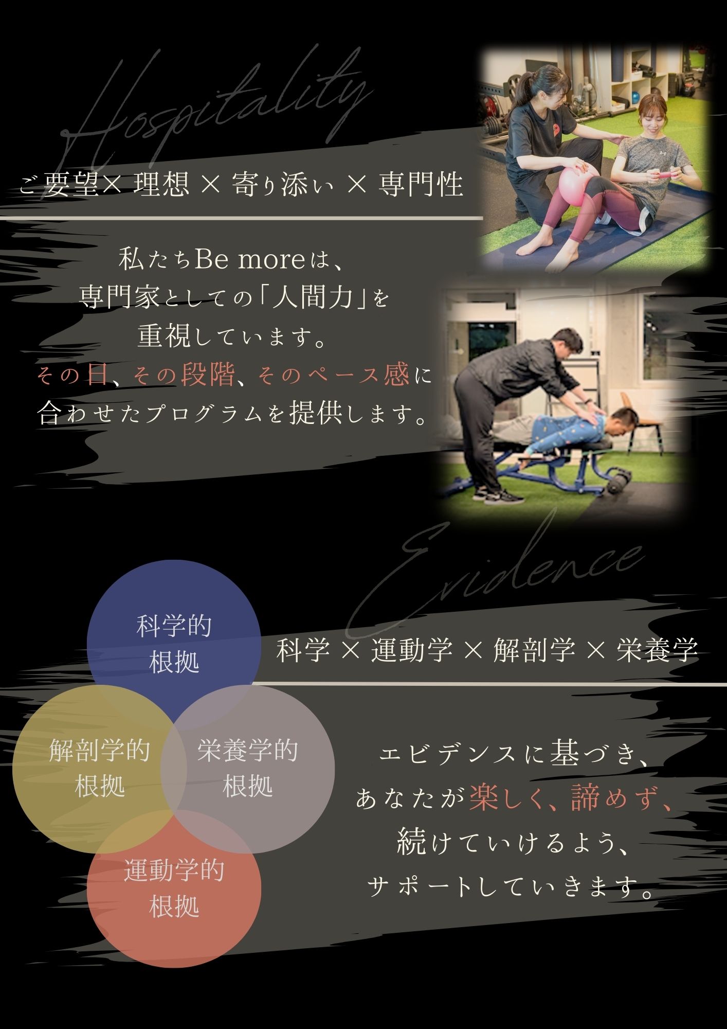 Be moreはトレーナー陣が整体の国家資格を持っていて、トレーニングの最後に10分くらい体をほぐしてくれるのが良いです!